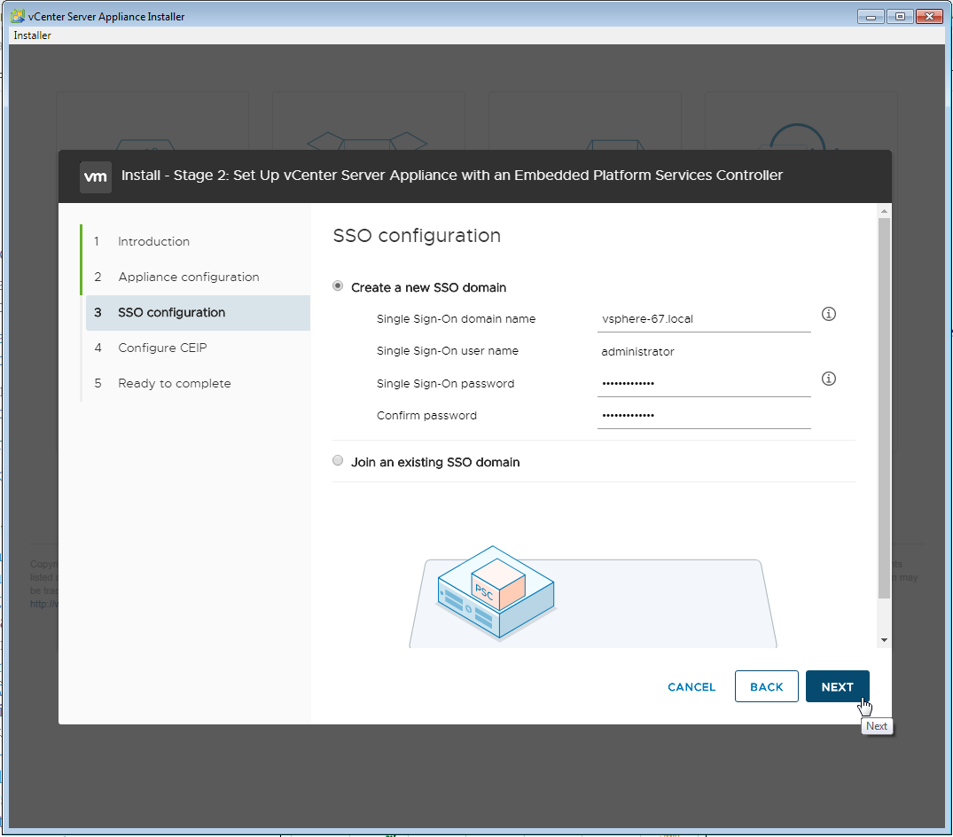 Мы не рекомендуем использовать vsphere.local (в одной из более ранних версий vCenter были некоторые проблемы с доменом vsphere.local, с тех пор мы не проверяли, как себя ведет это предлагаемое название, вероятно, уже все давно хорошо, но предпочитаем что-то немного отличающееся).