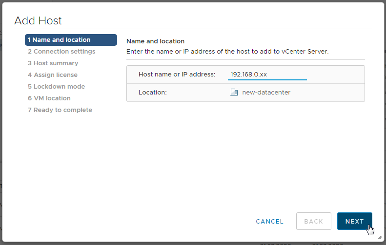 Переходим в этот дата центр и в Actions выбираем Add Host. Тут добавим ESXi.