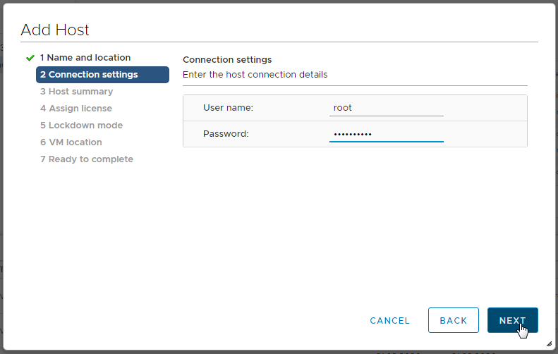 Указываем адрес хоста ESXi, логин и пароль для доступа к нему.