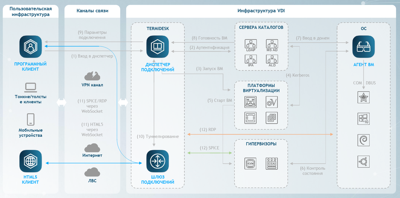 Основное назначение Termidesk заключается в автоматизации жизненного цикла виртуальных рабочих мест (ВРМ) и организации безопасной доставки рабочего места до пользователя с применением различных протоколов удаленного доступа к экрану.