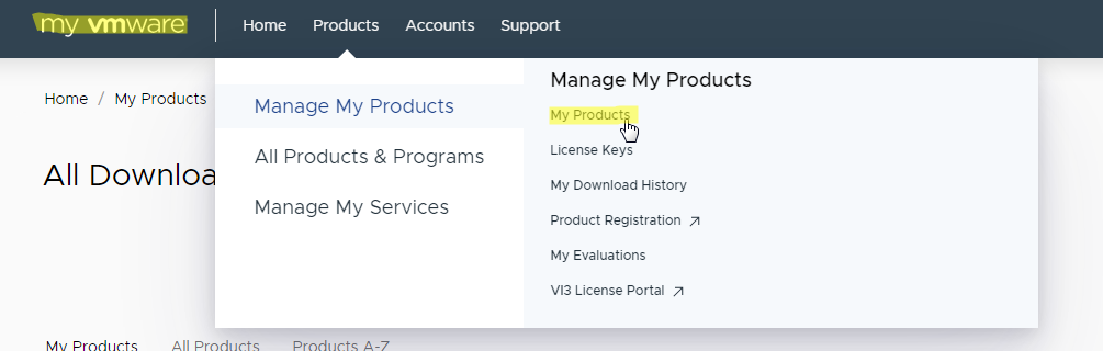 Для этого заходим на my.vmware.com и заходим под своим e-mail, зарегистрированным в момент покупки vSphere или запроса trial.
