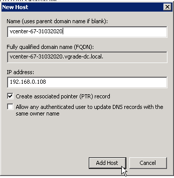 Так получилось, что у нас доменная машина, поэтому заходим на домен контроллер и добавляем DNS запись для vCenter: vcenter-67-31032020.vgrade-dc.local и ip адрес 192.168.0.108.