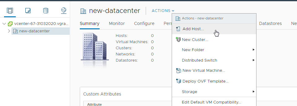Переходим в этот дата центр и в Actions выбираем Add Host. Тут добавим ESXi.