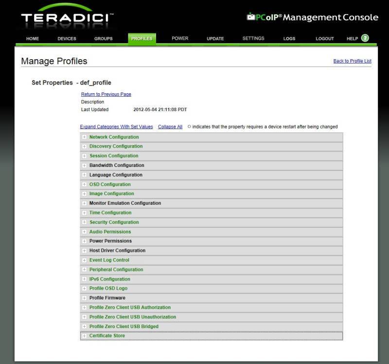 | Password | Click on Edit Properties to view | This property configures the Host or Zero Client local administrative password. This password is required to access the web interface. It is also required to modify certain configuration settings accessible through the OSD. The password is a string of zero to 20 characters. |